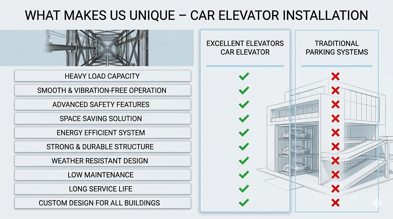 Advanced car elevator installation solutions designed for contemporary structures are provided by Excellent Elevators. Our systems are perfect for business buildings, apartment complexes, and car dealerships because they are made to move cars across several levels in a safe and effective manner. Car elevators are now a clever and useful way to transfer vehicles vertically due to the growing constraints on urban area.