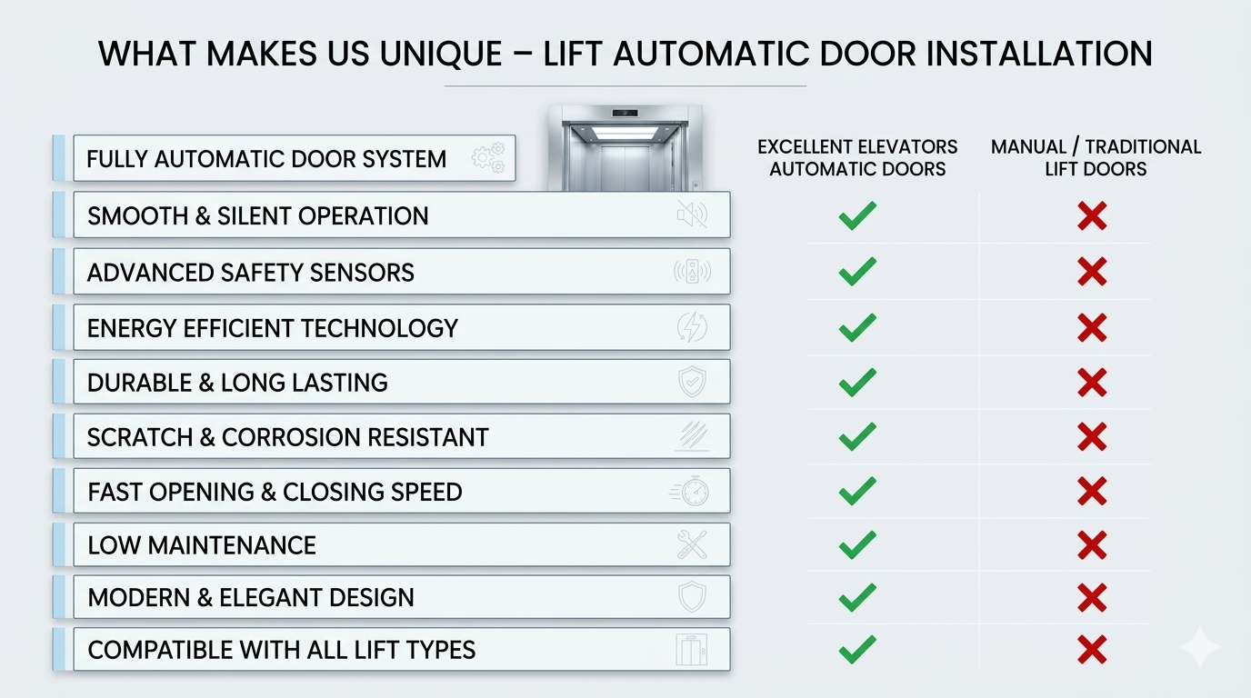 Excellent Elevators stands out for its commitment to quality, innovation, and customer satisfaction. With years of expertise in Lift Automatic Door Installation, we provide dependable solutions backed by professional service and technical excellence. Our team ensures timely project completion, precise installation, and ongoing support to maintain optimal performance.
