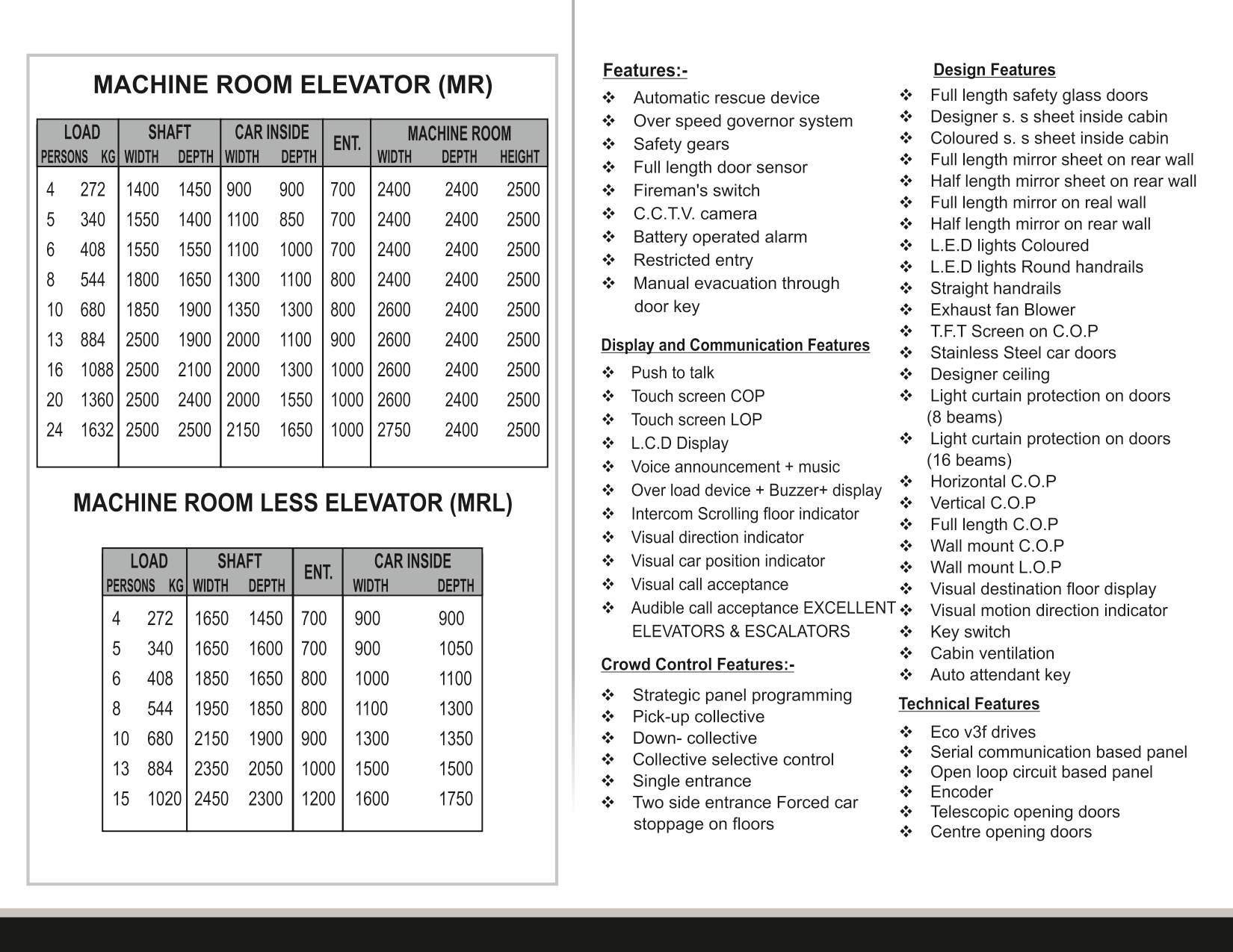 As Excellent Elevators Use Quality Products As Per International Standards, These Products Consume Less Energy, Provide Smooth Operation Due To High-end Mechanism We Use, Our Working Move's Around Latest Innovative Concept's With Produce Low Level Of Noise & Our Communication Systems Having Clear Crystal Voice Quality To Understand The Wording's Of Human Accordingly To Help At Any Time.